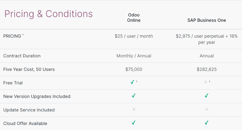 Due to its high cost, the SAP ERP system is available mainly to large enterprises. Since this expensive robust solution was out of reach of small and medium-sized businesses, by purchasing the SAP B1 system, SAP penetrated the SME (small and medium-sized enterprises) market segment. SAP B1 is a lower-cost ERP software offering designed for faster deployment and minimal customization (see pricing table below).