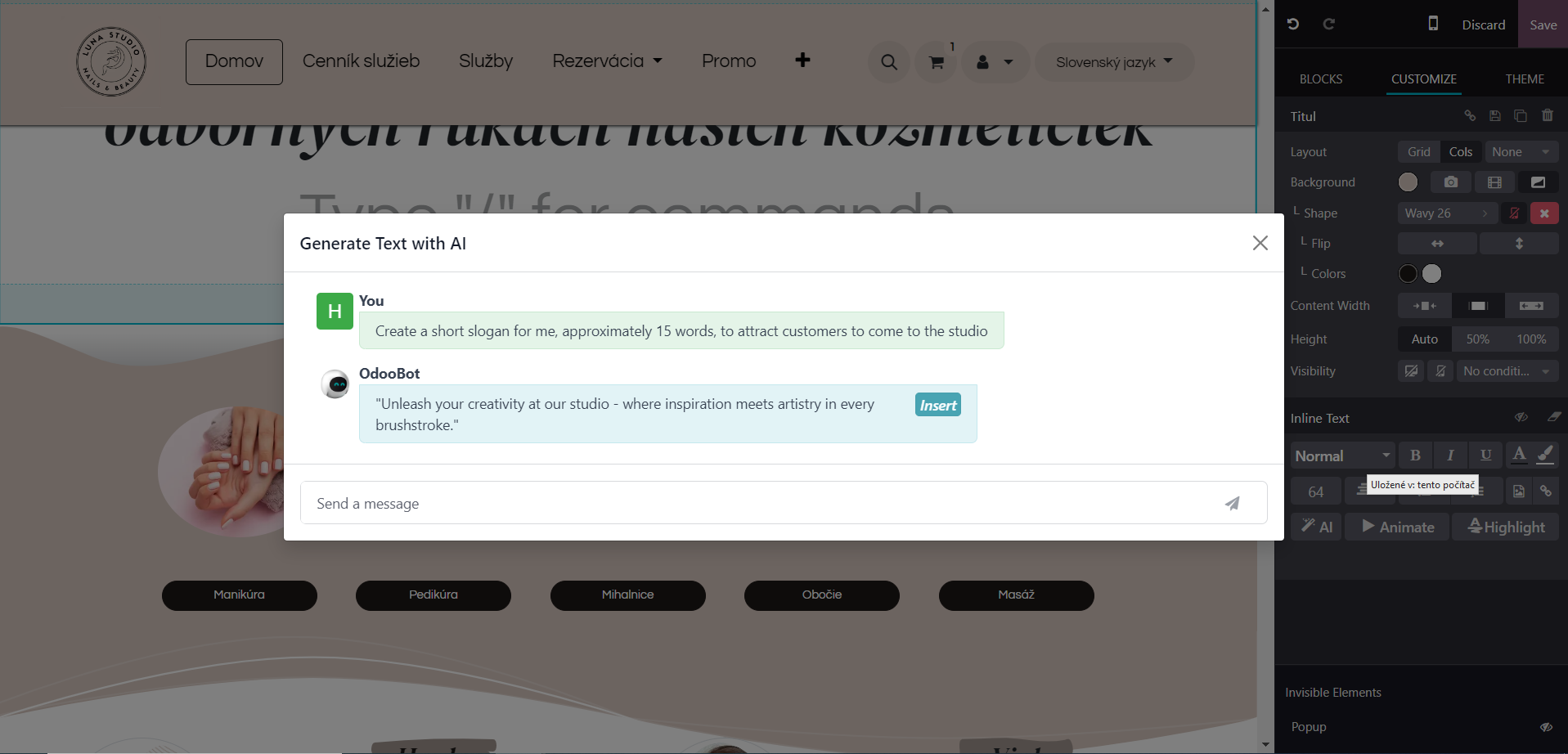 In version 17, Odoo integrated ChatGPT to revolutionize content generation across all applications. Whether it's crafting knowledge articles, marketing campaigns, or email templates, AI-powered assistance is at your fingertips. The Website app takes it a step further with auto-generated content tailored to your business needs, making website creation effortless and impactful.