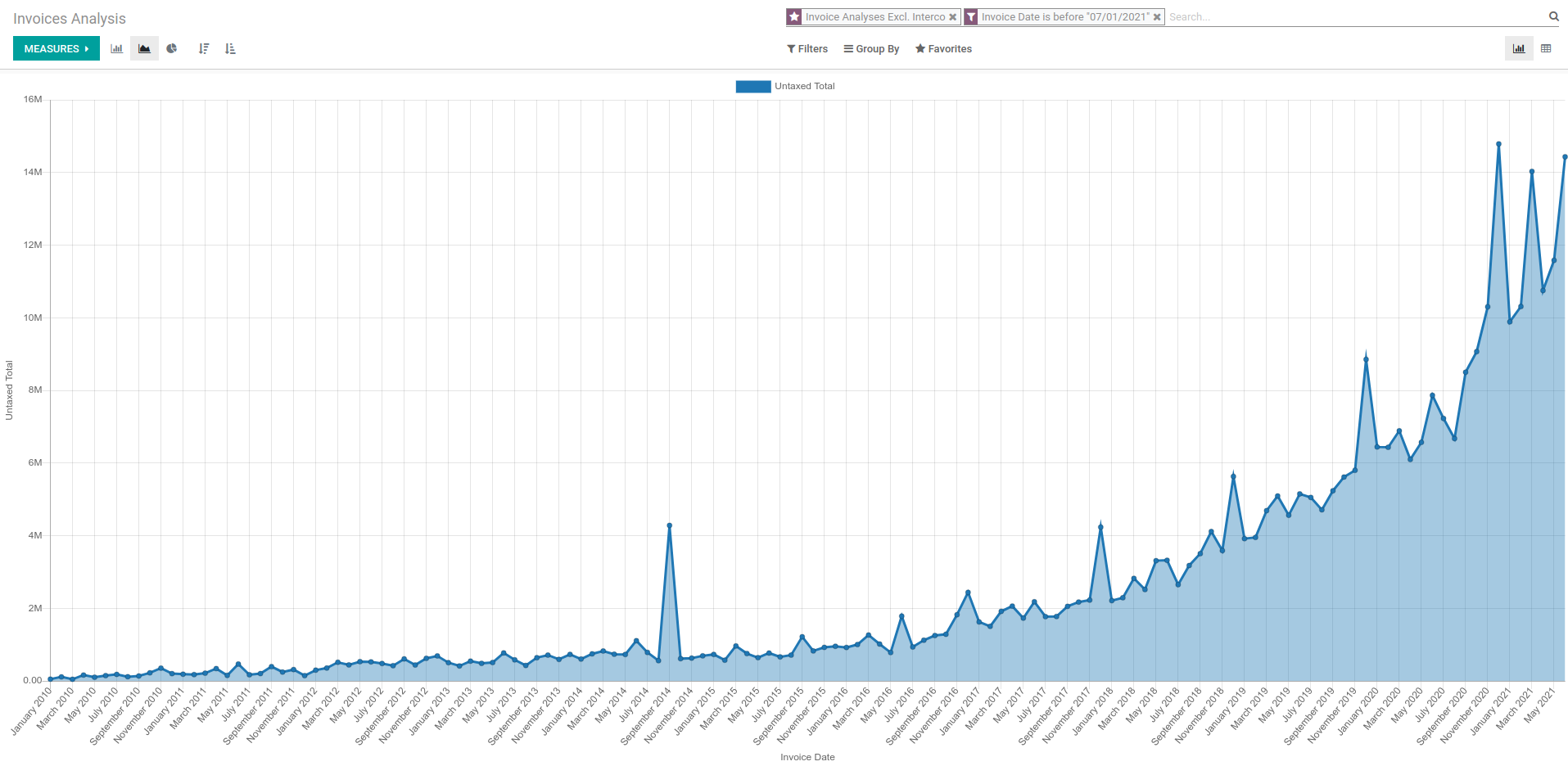 Odoo roste i exponenciálně. Zpočátku trvalo Odoo vytvořit obrat ve výši 4.00M€ deset let, pak dva roky, následně rok a loni už jen 4 měsíce.